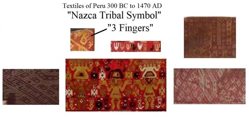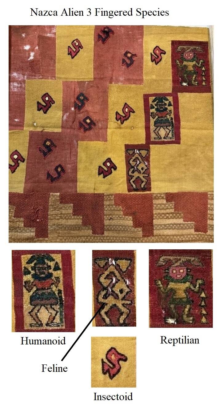 "The "Feline" Symbol" found in many textiles with the other 3 species of three fingered Nazca Aliens.