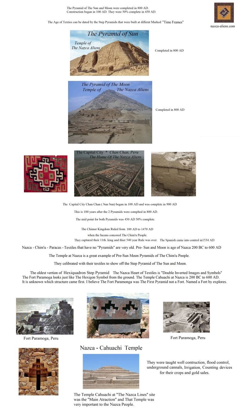 The first pyramid Paramonga was completed by 500 BC and are 2500 years old. The Pyramid at The Cahuachi Temple at Nazca was built by 200 BC. The Nazca People started migrating to the other two Pyramid site, The Sun and Moon.