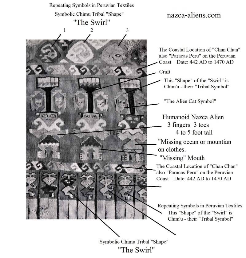 In many pictographs there are four toed people with little the guys, and three fingers and three toes of "The Nazca Aliens”. At this time in history, "The Large Skull People" were in power at Paracas, Peru, many "Large Skull People" were Kings in that time. You will see 4 fingered people in the textiles, they were Kings, and they have they little guys and the Humanoid Nazca Aliens with them in the textiles of Peru. Check out the Lord of Sipa'n. He was certainly a King. The Chimor Kingdom had 11 kings during their 570 year rule in Peru.