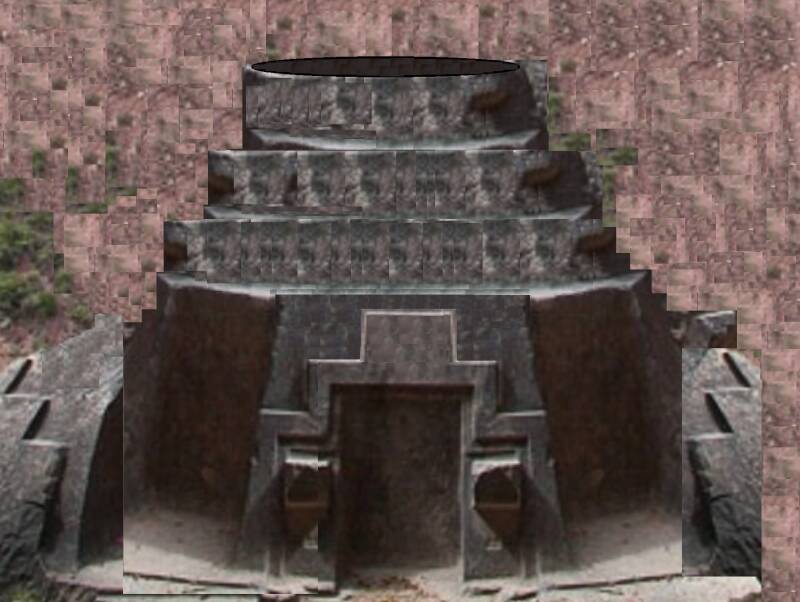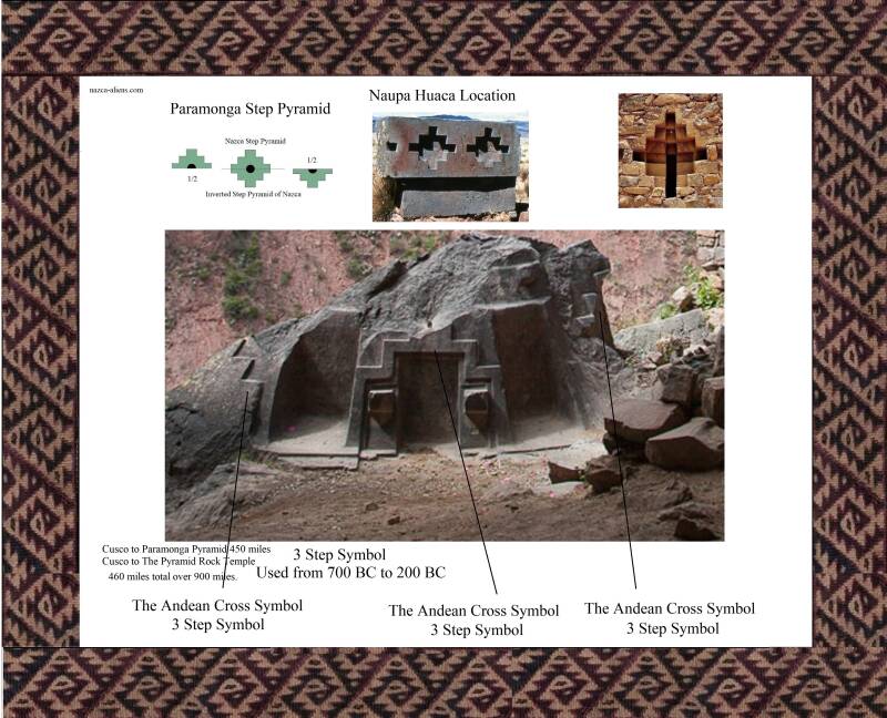The Carved Rock Temple Naupa Huaca that is 450 miles from Cusco, and 900 miles for its name sake, The 3 step Pyramid Paramonga.