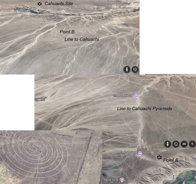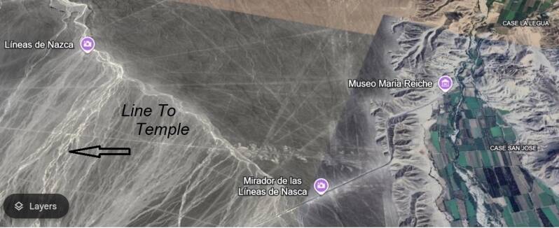 Depending on where you lived, you may join a caravan to travel the 300 miles to The Cahuachi Temple. Once you were in the Nazca Valley, you would walk your favorite "Nazca Line" on your way to the Temple. The 10 mile long straight line above shows your way to The Cahuachi Temple where the party was.